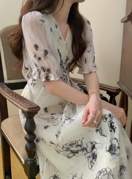 2022春夏新作 女 レディース ハイウエスト 半袖 Vネック ロング ワンピース 台型スカート