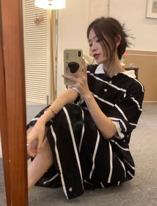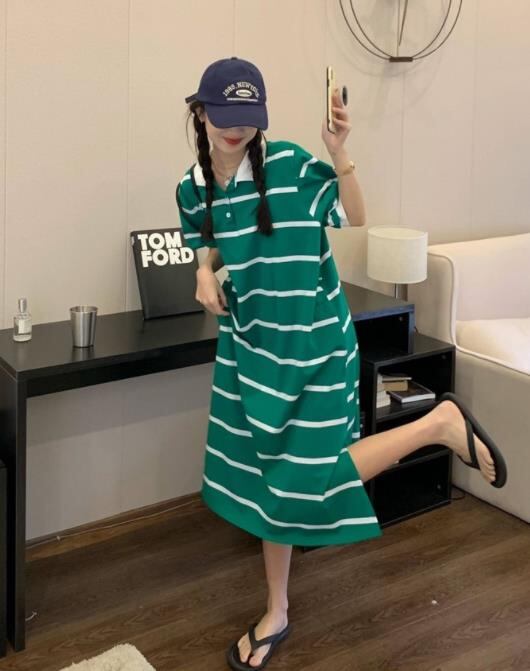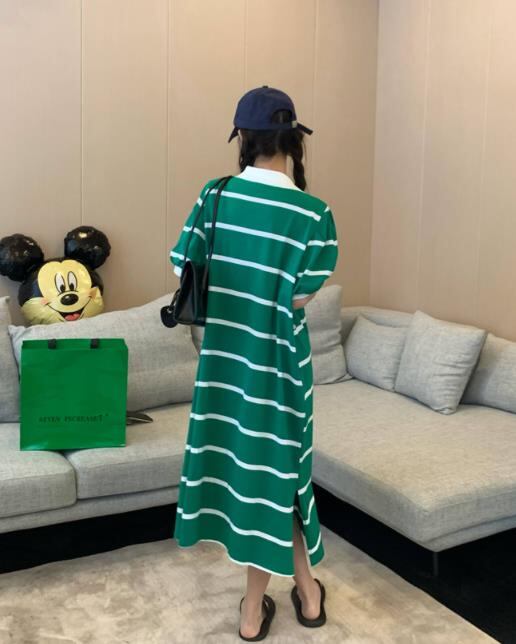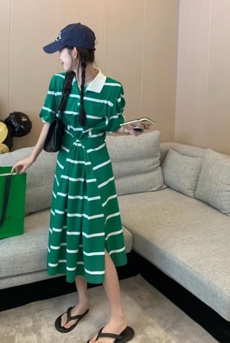 2022春夏新作 女 レディース ハイウエスト 半袖 ボーダー柄 ロング ワンピース 台型スカート 2色