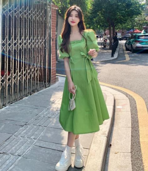 2022春夏新作 女 レディース ハイウエスト 半袖 無地ロング ワンピース 台型スカート S-3XL