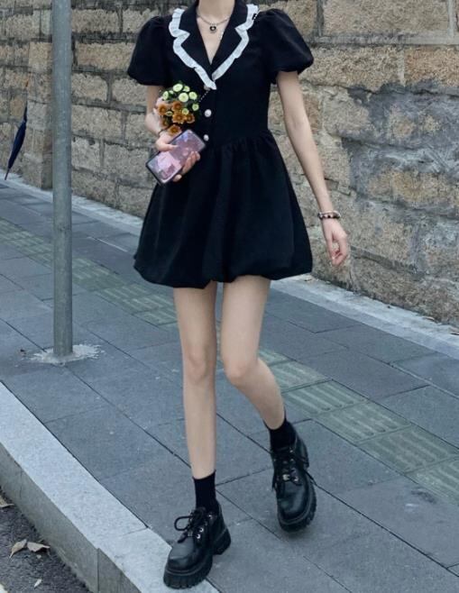 2022春夏新作 女 レディース ハイウエスト 半袖 パフスリーブ ミニ ワンピース ドレス 台型スカート S-2XL