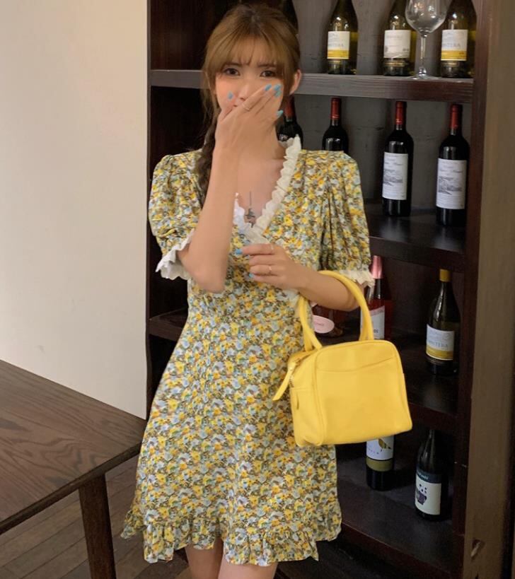 2022春夏新作 女 レディース ハイウエスト 半袖 花柄 ミニ ワンピース ドレス 台型スカート 2色