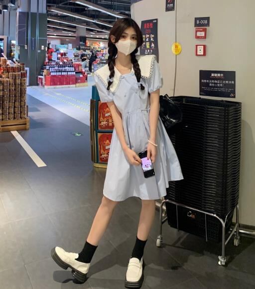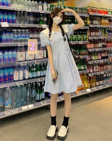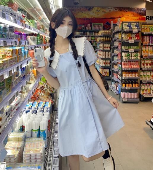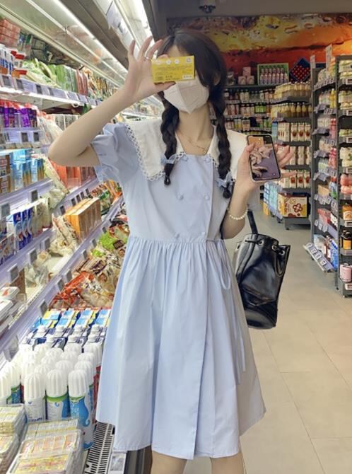 2022春夏新作 女 レディース ハイウエスト 半袖 ミニ ワンピース ドレス 台型スカート 2色 M/L