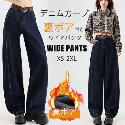 裏起毛 ワイドパンツ デニム レディース パンツ カーブパンツ デニムパンツ ボアづき 冬 ゆったり 体型カバー ジーンズ ボアパンツ 暖かい ワイドカーブパンツ 裏ボア あったか コクーンパンツ 秋