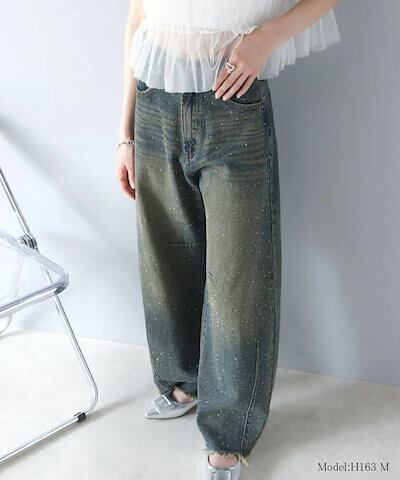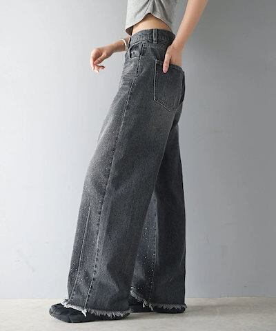 Classical Elfmilybilet ボトムス パンツ レディース オーロラ ストーン付き ヴィンテージ ライク カーブ ワイド デニムパンツ 裾 フリンジ ウォッシュ 加工 大きいサイズ