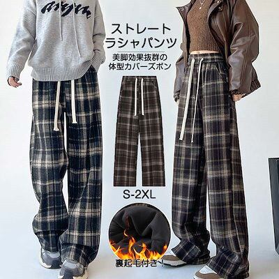 ストレートパンツ レディース ラシャ チェック ボア付き ハイウェスト パンツ 美脚 脚長 ストレート 体型カバー ボトムス ロング ボア 厚手 マキシ丈 ワイド ボトム 裏起毛 ワイドパンツ ロング