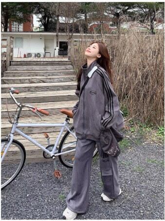 2024 春秋 2点セット トップス お出かけ 羽織り ショート丈 セットアップフルパーカーラウンドヘムルーズ サイド上下ボトムス ストレート系冬 ゆったりサイズワイドシルエットリラックストラック