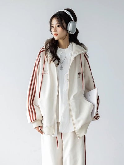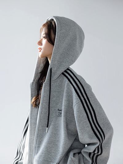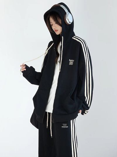 2024 秋冬 2点セット トップスパーカー フード付き チャック韓国羽織り ショート丈 フルパーカー ルーズ サイド上下ボトムス ストレート系冬 ゆったりサイズワイドシルエットリラックストラック