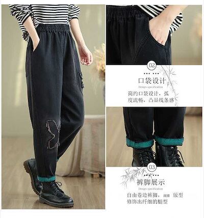 「ファットガール」 2024冬新品 裏起毛 デニムパンツ テーパードパンツ 蝶柄刺繍 大きいサイズ 体型カバー 厚手 保温 レディース ロングパンツ ジーンズ メガ割