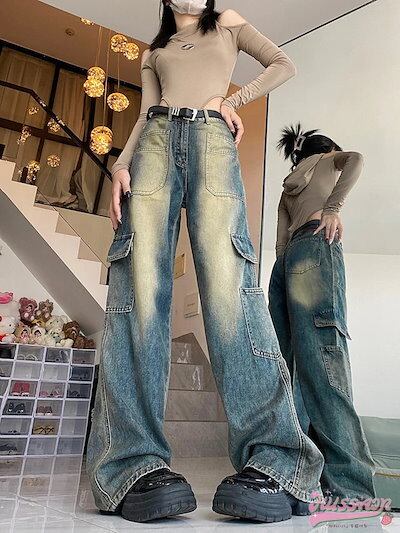 2024夏秋 パンツ デニム ジーンズ ワイド ストレート ハイウエスト デニムジーンズ 脚長効果 美脚効果 細見え ウォッシュ加工 ポケット 春 カジュアルレディース お出かけ