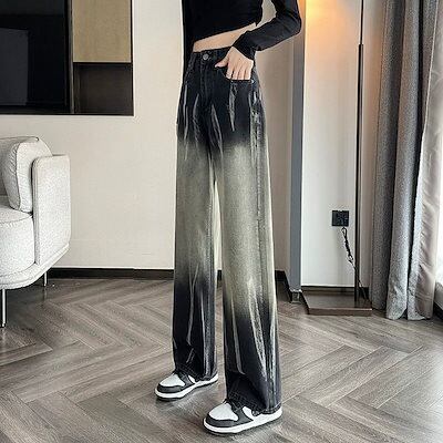 グラーデション 絞り染 ジーンズ 春秋 レディース ゆったり ストレート ワイドレッグ モップパンツ デニム ロングズボン