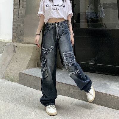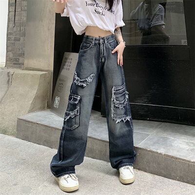 レトロ ジーンズ レディースファッション オールマッチ ストレート 垂れ感 ロングズボン ゆったり デニム ワイドパンツ