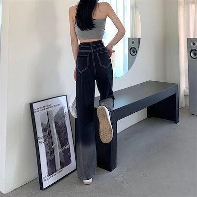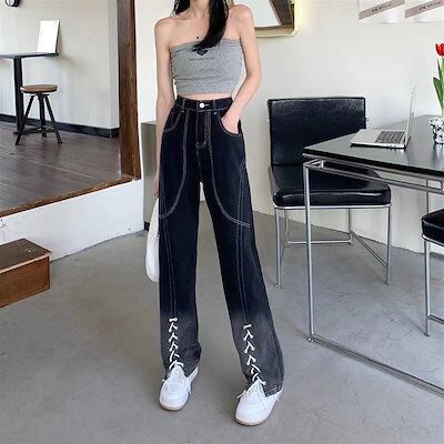 アメリカ 絞り染 ジーパン レディー レトロ ワイドパンツ デザインセンス ブラック 流行り ins ストレートパンツ