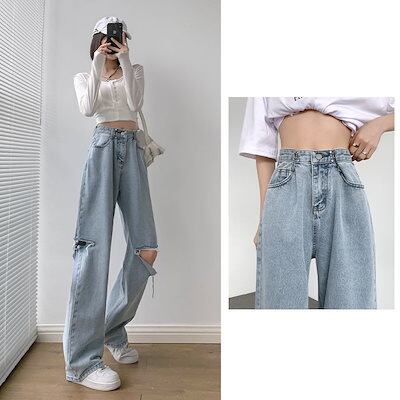 おしゃれ 個性 破れズボン デニムパンツ レディース 春秋新品 ゆったり ストレート ハイウエストパンツ