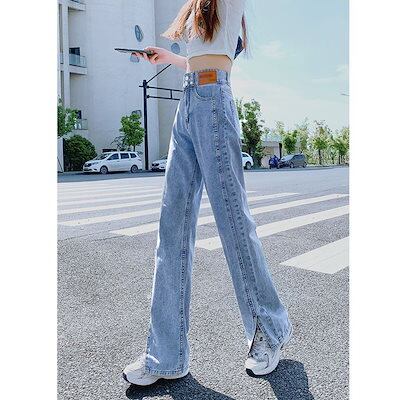 春秋新作 ハイウエスト デニムパンツ レディース ゆったり スリット ストレート ワイドパンツ