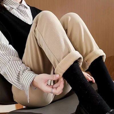 新しい レディース 冬 裏起毛 厚手 デニム ストレートパンツ カーキ ファッション トレンド ズボン