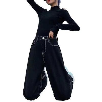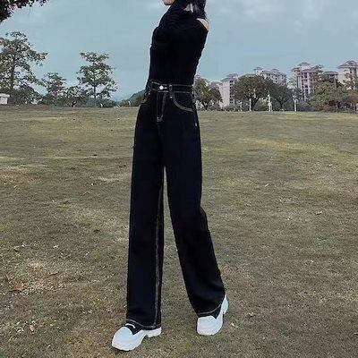 秋冬 ニュースタイル 裏起毛 厚手 ハイウエスト ブラック レディース ジーンズ ゆったり 着痩せ ワイドパンツ