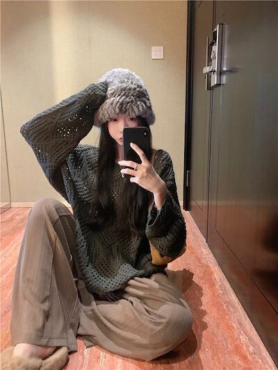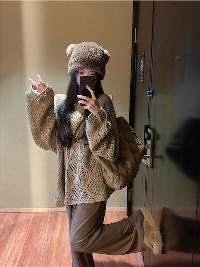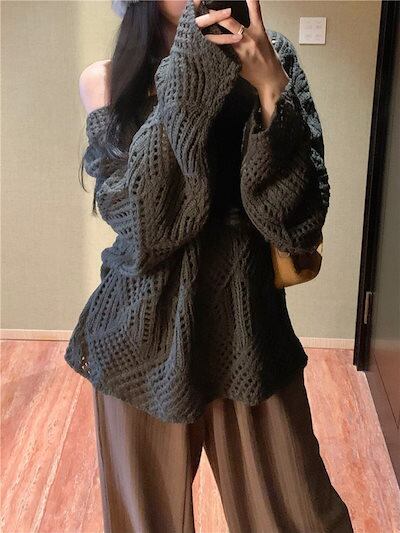 2024秋冬トップス ニット 透かし彫り 長袖 オフショルダー ゆったり 細見え 秋 茶色 おしゃれ かわいい ガーリー キュート 韓国ファッション レディース お出かけ