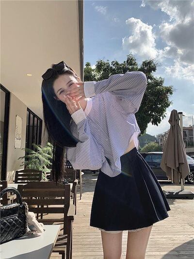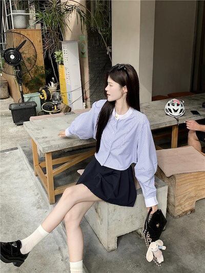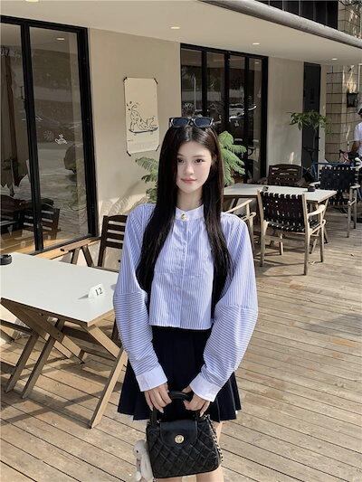 2024秋冬トップス シャツ 長袖 ストライプ ボタン 襟 スタンダードカラー 秋 青 ブルー おしゃれ かわいい 韓国ファッション レディース お出かけ