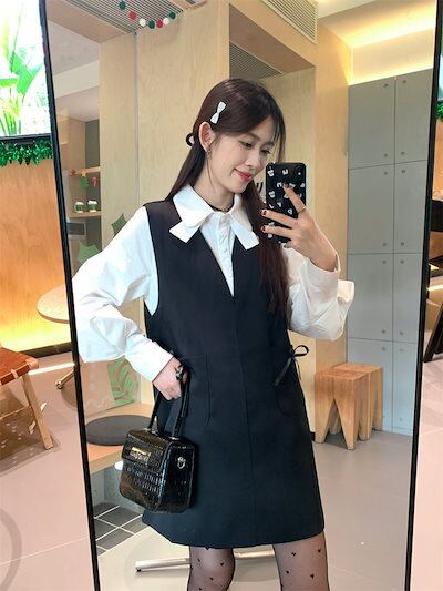 2024秋冬2点セット ワンピース ミニ丈 ジャンパースカート ジャンスカ Vネック リボン トップス シャツ 長袖 秋 白 黒 おしゃれ かわいい 韓国ファッション レディース お出かけ