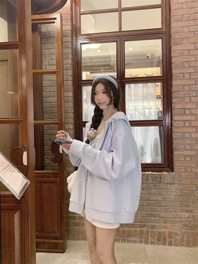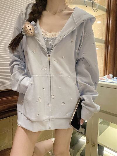 2024 秋冬トップス パーカー フード付き ジップ チャック 長袖 花柄 ポケット 大きめサイズ ゆったり 細見え 秋 水色 おしゃれ かわいい ガーリー キュート 甘め 韓国ファッション レディー