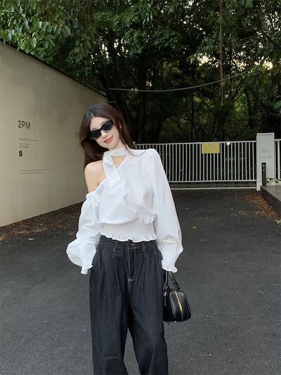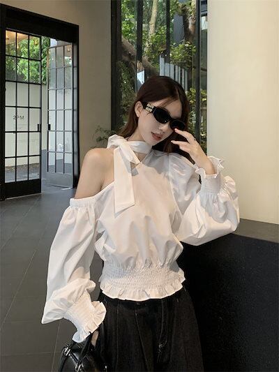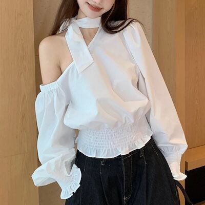 2024秋冬トップス シャツ 長袖 ワンショルダー 肩見せ リボン 秋 白 ホワイト おしゃれ かわいい きれいめ 大人っぽい 韓国ファッション レディース お出かけ