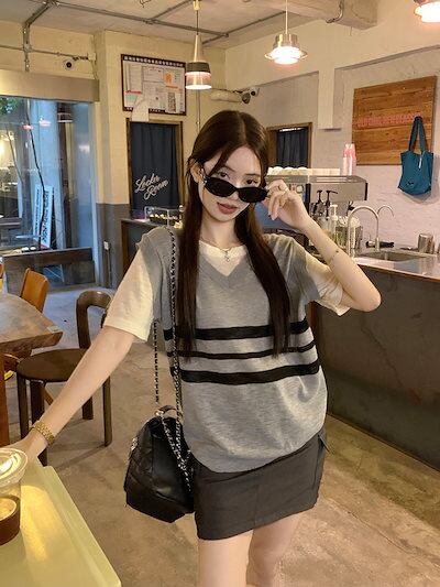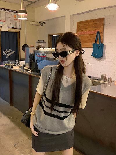 2024秋冬トップス ベスト ニット Vネック ボーダー 半袖 グレー 秋 ゆったり 韓国ファッション レディース おしゃれ かわいい カジュアル お出かけ