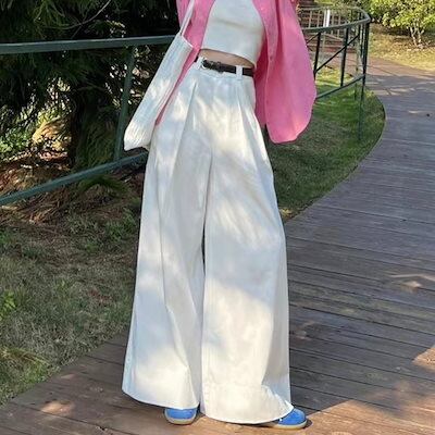 2024パンツ ロング丈 ワイド ハイウエスト 美脚効果 脚長効果 細見え 秋 白 ホワイト おしゃれ かわいい 韓国ファッション レディース お出かけ