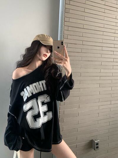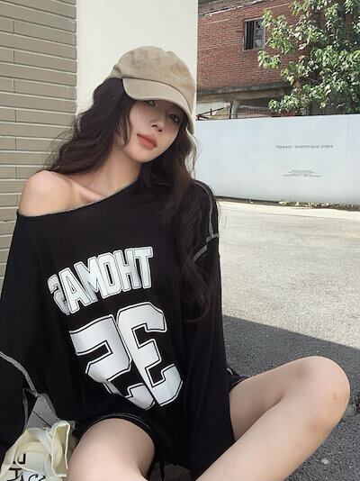 秋韓国可愛い風トップス Tシャツ ファッション系 長袖 プリント ルーズ サイド ペイントシルエットゆったり丈 レディースサイズ韓国Vネック おしゃれ カジュアル メンズライク T