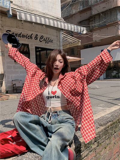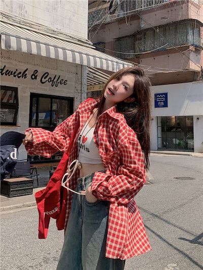 2024夏トップス シャツ 長袖 ボタン 襟 チェック柄 ゆったり 細見え 夏 赤 レッド おしゃれ かわいい 韓国ファッション レディース お出かけ