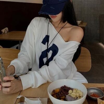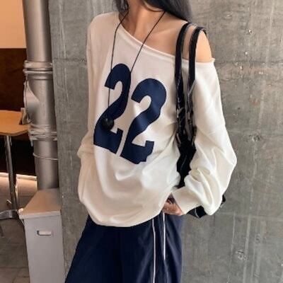 2024 夏トップス スウェット 長袖 ワンショルダー 数字 22 肩見せ ゆったり 細見え 夏 ホワイト 白 おしゃれ かわいい 韓国ファッション レディース お出かけ