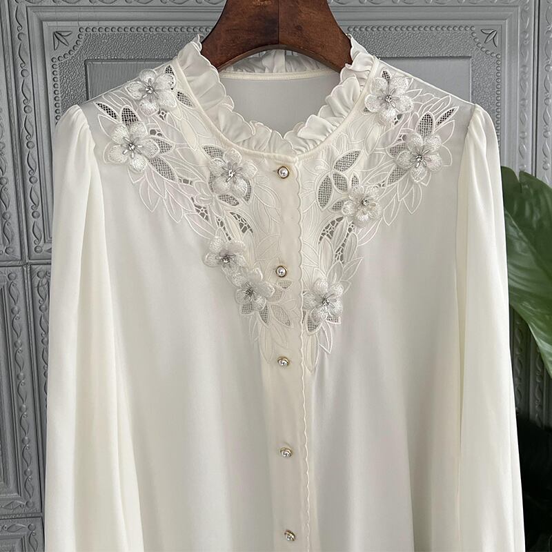 初回送料無料新しいトップス長袖シャツフリルネック刺?レースブラウス人気商品ファッション