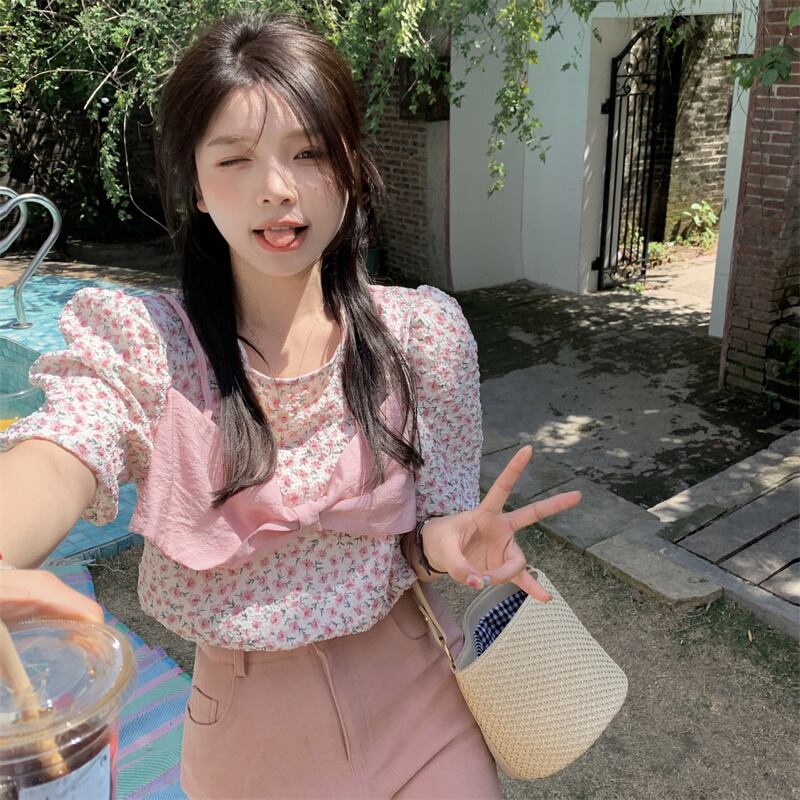 初回送料無料パフスリーブサスペンダーシャツフェイクツーピースレディースファション服トップス