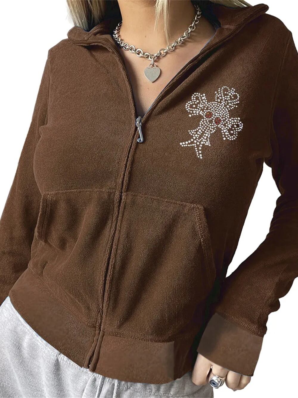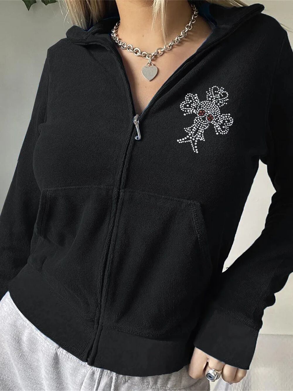 女性のスケルトンラインストーンフーディー、ティーンガールスウェットシャツ、秋のゴシックフーディー、長袖、ジッパーアップ服、y2k パーカー ジャージ y2k T240908201940_01