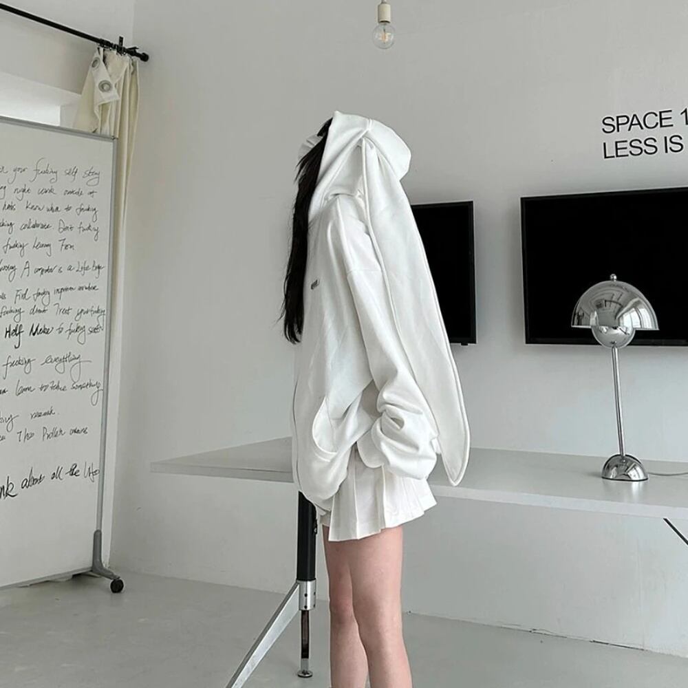 ウサギの耳が付いた女性の原宿スタイルのジップアップパーカー、ルーズパーカー、カジュアルシック、ホワイト、ブラックコート、カワイイ服、女の子、韓国、y2k、春、秋 パーカー ジャージ y2k T240908202010_01