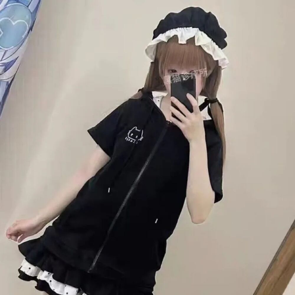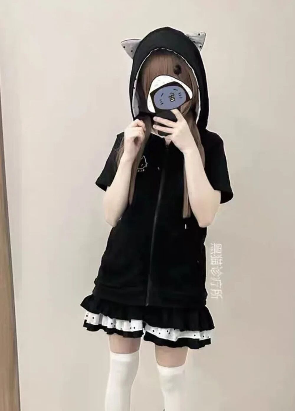 女性用半袖ジッパーパーカー、ルーズカワイイトレーナー、キャットイヤードット、ブラック、プレッピースタイル、スウィート、y2k、日本製、夏 パーカー ジャージ y2k T240908202212_01